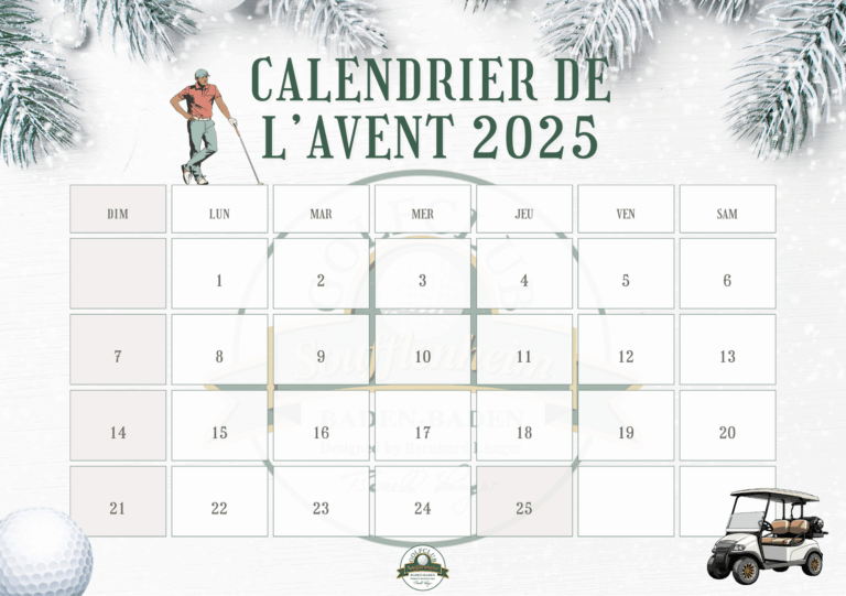 Save the Date – Dès le 1er décembre ! Calendrier de l’Avant au Golf de Soufflenheim. Cette année, on vous gâte ! Chaque jour, découvrez une offre exceptionnelle, valable uniquement le jour J. À suivre également sur nos réseaux sociaux… toutes les offres y seront