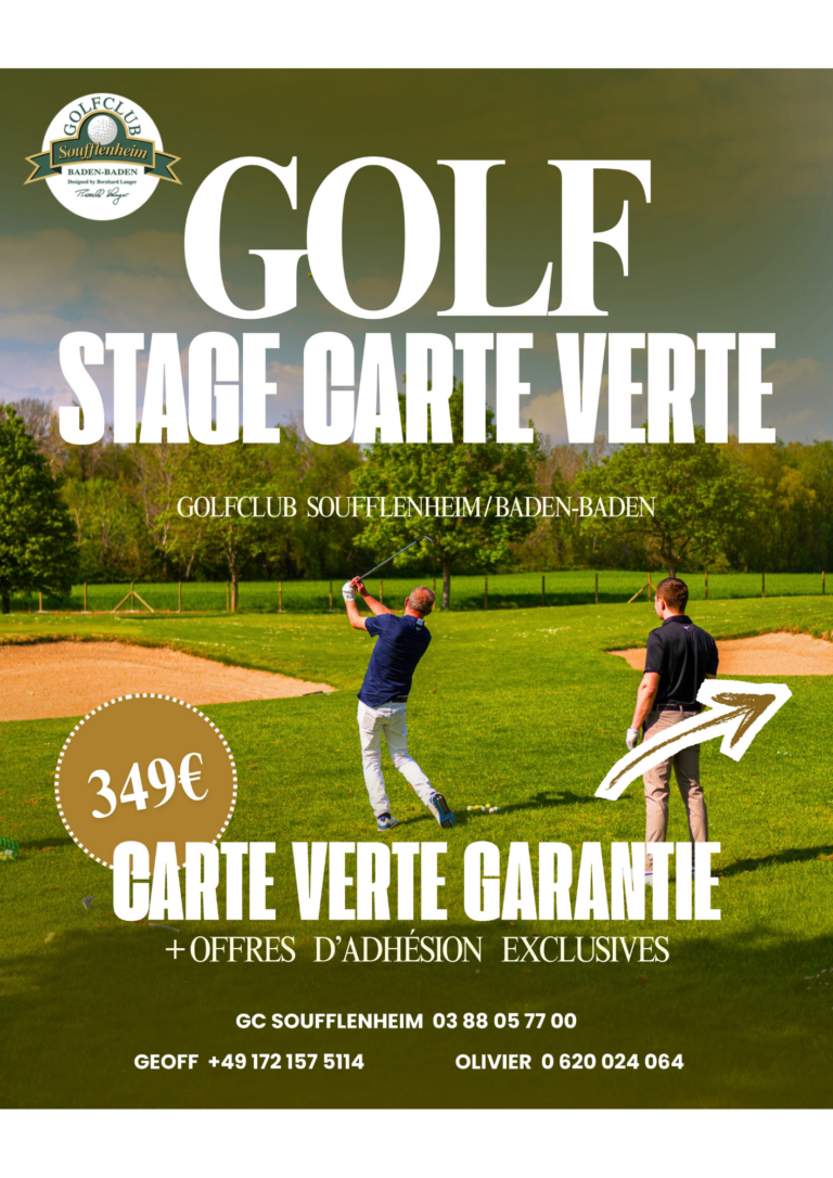 Le Golf Club de Soufflenheim propose un stage complet 𝐝𝐞 𝟖 𝐬𝐞𝐦𝐚𝐢𝐧𝐞𝐬 𝐚̀ 𝟑𝟒𝟗€ pour débuter dans les meilleures conditions. 2 entraînements par semaine avec nos pros certifiés PGA Accès illimité au practice (Top Tracer éclairé) et au parcours 6 trous Matériel fourni Examen de